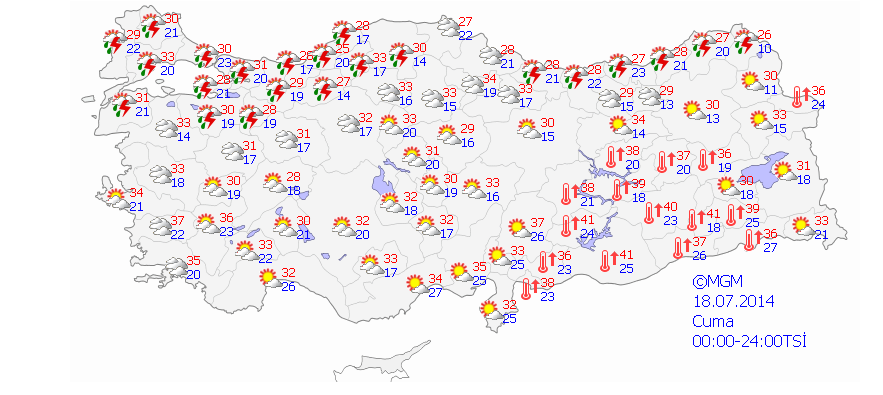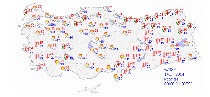 Yapılan son değerlendirmelere göre: Ülkemizin kuzey ve iç kesimlerinin parçalı, yer yer çok bulutlu; bugün Doğu Karadeniz, Doğu Anadolu'nun kuzeyi, Batı Karadeniz'in iç kesimleri, Ordu ve Toroslar mevkiinin sağanak ve gök gürültülü sağanak yağışlı, diğer yerlerin az bulutlu ve açık geçeceği tahmin ediliyor.