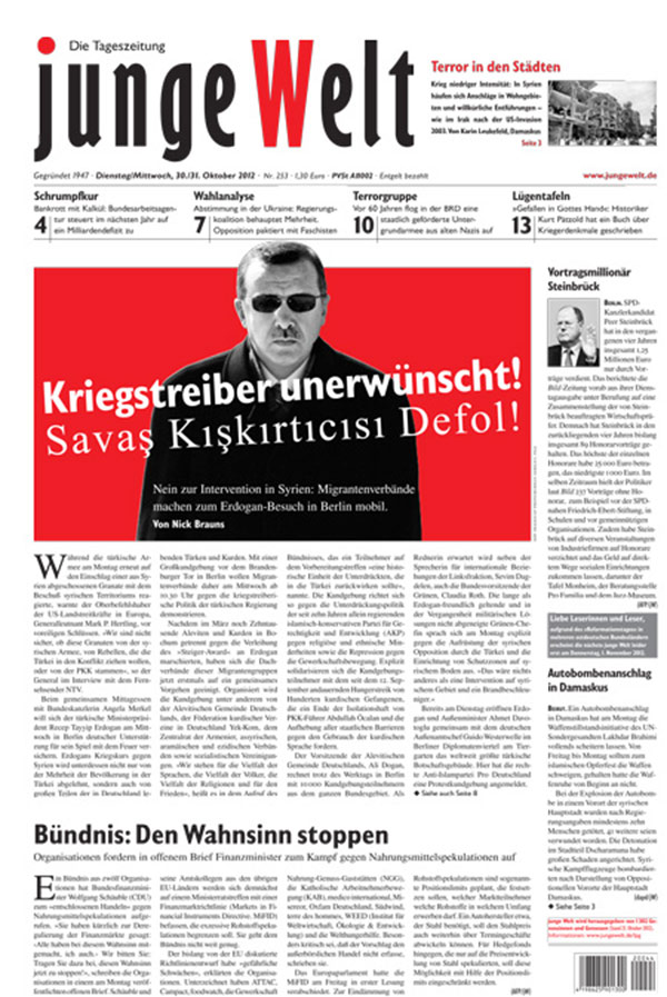 Gazete yazarlarından Nick Brauns imzalı haber-yorumda Türkiye'li göçmenlerin Başbakan Erdoğan'ı Almanya'da istemediğine dikkat çekildi. Gazete AK Parti hükümetinin Kürt politikası, azınlık politikası ve Suriye ile savaş politikasına yer verdi.