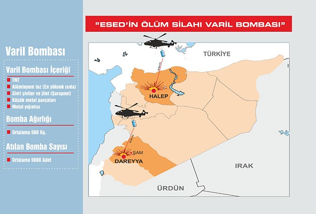Suriye İnsan Hakları Örgütü'nün (SNHR) hazırladığı 'varil bombası raporunda' rejimin son aylarda muhaliflerin elinde bulunan bölgeleri hedef alan varil bombalı saldırılarının bilançosuna yer verildi. Saldırıların son haftalarda artan bir yoğunlukta devam ettiğine işaret edilen raporda, sözkonusu saldırıların, 364'ü çocuk ve yüzde 97'si sivil olmak üzere 4 bin 173 kişinin ölümüne neden olduğu kaydedildi.