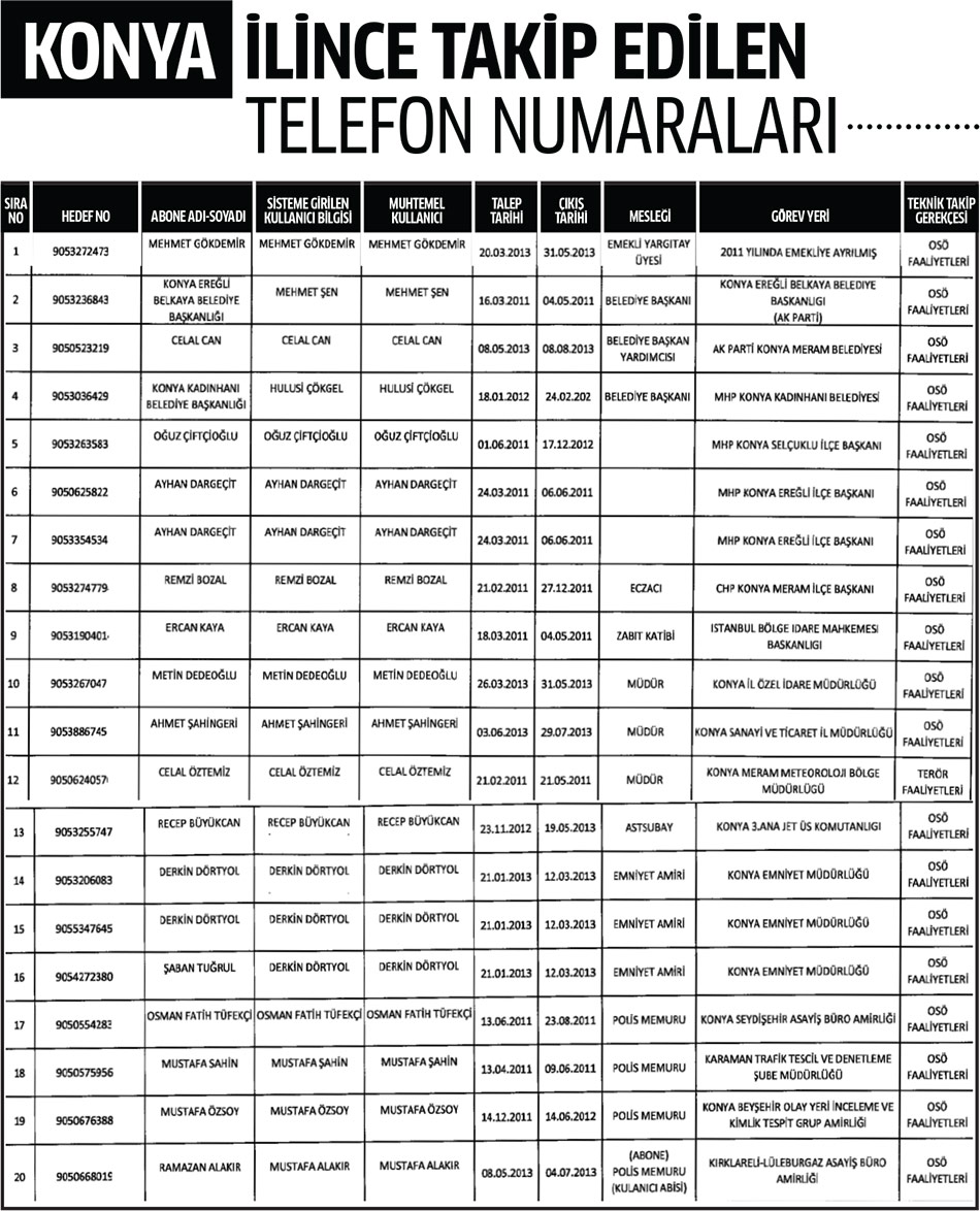 Star'ın haberine göre ‘selam Terör Örgütü' bahanesiyle binlerce kişinin illegal dinlendiğinin orta çıktığı tarihi telekulak skandalı bitmek bilmiyor. Şimdi de 30 ilde aralarında çok sayıda valilik ve kaymakamlıkların da yer aldığı siyasi partinin il ve ilçe teşkilatları, emniyet müdürlükleri ve amirlikleri, adliyeler, savcılar, hakimler, polis memurlarından emniyet müdürlerine kadar her kademeden emniyet görevlisi, TSK mensupları, belediye başkanlıkları, STK yöneticilerinin ‘terörist' ve ‘organize suç örgütü'üyesi gibi gösterilerek üç yıl boyunca illegal olarak dinlendiği ortaya çıktı.