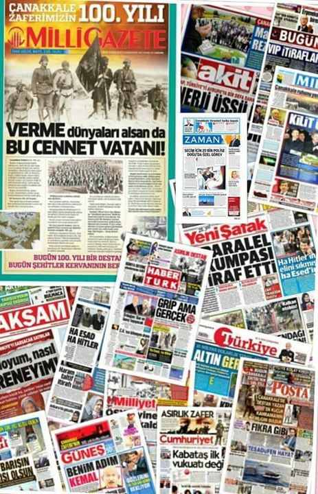 birçok kuruluşu ve Sivil toplum kuruluşlarının hemen hepsi “Çanakkale zaferini anma gün ve geceleri” tertiplemişlerdir. Ülkemiz bu çalışmalarla çalkalanırken “18.Mart.2015 tarihli gazeteler (biri hariç) bakın sayfalarını nelerle doldurmuş, neleri birinci haber olarak öne çıkarmışlardır.