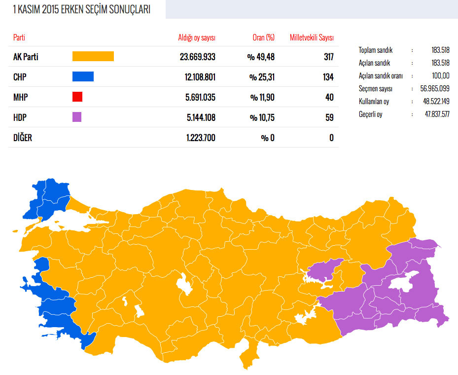 MHP’de tabanından Ak Parti’ye ciddi kayış gerçekleşti. AK Parti 1 Kasım’da PKK’yla çatışmasızlık ortamının sona ermesi ve milliyetçi bir dil kullanmaya başlamasının meyvelerini aldı, İç Anadolu ve İç Ege’de MHP’ye kaptırdığı oyları bir bir geri aldı. MHP özellikle Selçuklu Hilali olarak bilinen Niğde, Nevşehir, Kırşehir, Yozgat, Çorum, Tokat, Kayseri başta olmak üzere birçok ilde kan kaybına uğradı. Orta Anadolu, Karadeniz ve İç Ege’de oyların radikal bir oranda Ak Parti’ye yöneldiği gözlendi.