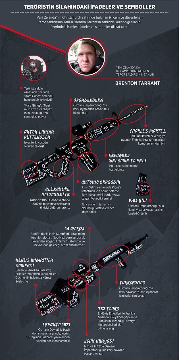 Tarrant'ın silahına yazdığı isimler arasında tarihte Osmanlılara karşı savaşmış Lazar Hrebeljanovic, Milos Obilic, Baja Pivljanin, Novak Vujosevic gibi Sırp figürler yer alırken, araçta çalan Sırpça şarkının sözlerinde "Bosna Kasabı" olarak bilinen savaş suçlusu Radovan Karadzic'e yönelik övgü dolu ifadeler duyuluyor.