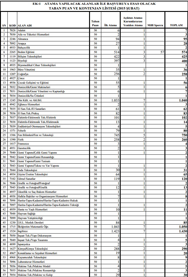 15 bin öğretmen kadrosuna atama yapılacak alanlar ile başvuruya esas olacak taban puan ve kontenjan listesi Milli Eğitim Bakanlığı (MEB) İnsan Kaynakları Genel Müdürlüğü sitesinden açıklandı.