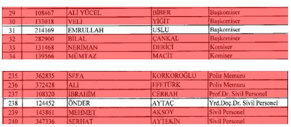Bu kişiler arasında kamuoyunun yakından tanıdığı ve şu an firari olan eski Polis Akademisi öğretim üyesi Önder Aytaç ve eski baş komiser Emrullah (Emre) Uslu da yer alıyor.