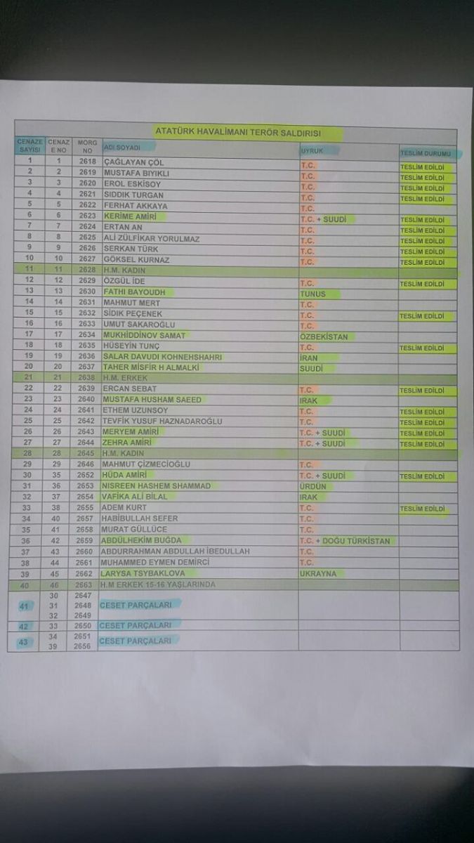 Atatürk Havalimanı Dış Hatlar Terminali'nde canlı bomba saldırısında ölenlerin kimlikleri belirlendi.
