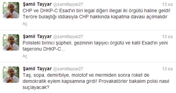 Twitter'daki hesabında CHP ve DHKP-C'ye yüklenen AK Partili Şamil Tayyar, CHP ve DHKP-C Esad'ın biri legal diğeri illegal iki örgütü haline geldi! Teröre bulaştığı iddiasıyla CHP hakkında kapatma davası açılmalıdır, açıklamasında bulundu.