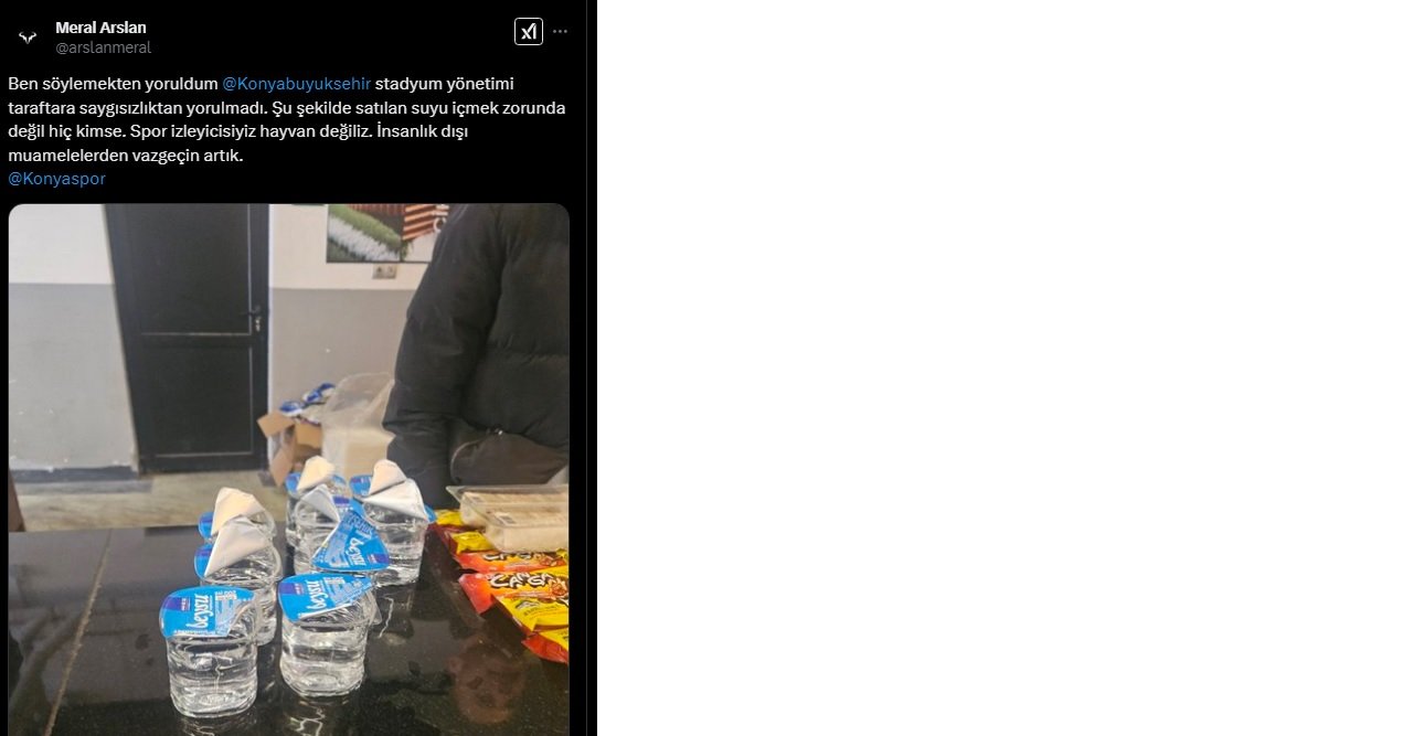 Bir Konyaspor taraftarı MEDAŞ Konya Büyükşehir Belediye Stadyumu’nda yapılan su satış şekline tepki gösterdi. Küçük bardak suların ağzı açık şekilde taraftara satılmasını fotoğraflayan bayan taraftar sosyal medya hesabından yaptığı paylaşımla stadyumda yapılan bu satış şeklini eleştirdi.