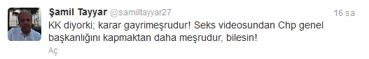 Tayyar, yazdığı tweetinde “Kemal Kılıçdaroğlu karar gayrimeşrudur! Seks videosundan CHP genel başkanlığını kapmaktan daha meşrudur, bilesin!' ifadelerini kullandı.